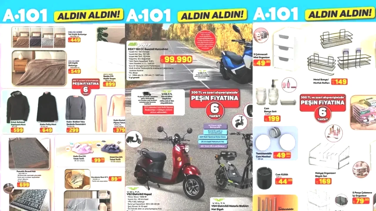 A101, bu hafta "Aldın Aldın" adıyla satışa sunduğu yeni katalog ürünlerini duyurdu. 2 Nisan 2026 tarihli A101 Aldın Aldın indirim kataloğu, Perşembe günü raflarda yerini alıyor. Bu haftaki broşür içerisinde; 125 CC maxi scooter 59.990 TL, 50" 4K ultra HD Vidaa TV 17.999 TL, oyun klavyesi 449 TL, akım korumalı 3'lü makaralı uzatma kablosu 489 TL, tüy alma makinesi 149 TL, Türk kahve makinesi 1.599 TL, rendeli metal kase seti 849 TL, aynalı dekoratif sunum tepsisi 139 TL, yemek tabağı 115 TL, pasta tabağı 110 TL, emaye pişir sakla tencere 329 TL, olta sehpası 329 TL, olta kamışı 1.349 TL, lüks katlanabilir kamp sandalyesi 1.599 TL, desenli izolasyonlu piknik sepeti 25 L 449 TL, katlanabilir kamp taburesi 119 TL, balıkçı filesi 149 TL, balıkçı makası 59,50 TL, şarjlı el feneri 129 TL, reflektörlü kedi tasması 69,50 TL, şarjlı hareketli top kedi oyuncağı 199 TL, evcil hayvan eğitim pedi (10'lu) 109,50 TL, spino ultra yedek parça 109 TL, plastik duvar boyası (10 KG) 429 TL, tüy toplayıcı roller 64,50 TL, yastık alezi (2'li) 279 TL, ortopedik boyun destekli visco 549 TL, ekose masa örtüsü 79,50 TL ve büyük boy hurç 59,50 TL yer alıyor. Yeni A101 afişine ait ürünlere market raflarından ulaşmak mümkün. Peki, A101 bu hafta hangi ürünleri sunuyor? İşte 2 Nisan A101 aktüel ürün listesi...